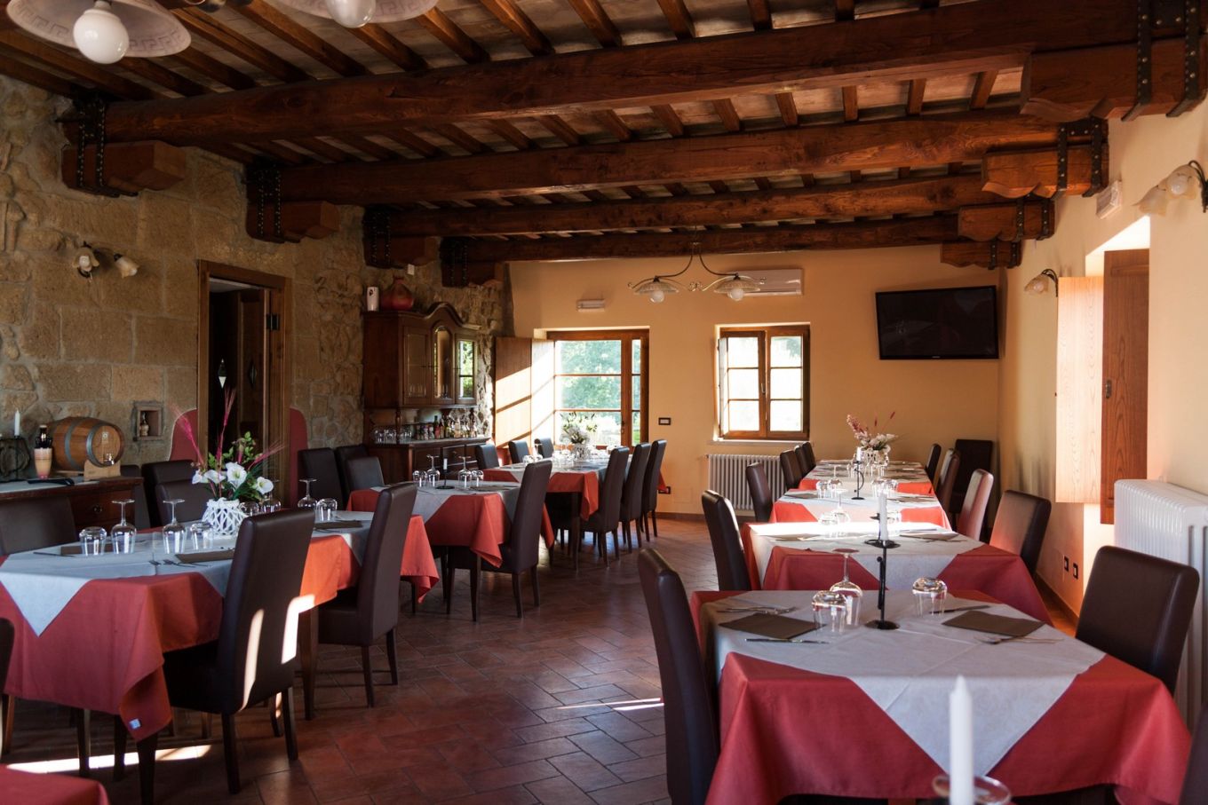 La sala dedicata al pubblico è completamente arredata in legno; l'atmosfera è rustica ed elegante al tempo stesso, con un bel soffitto con travi a vista, luci d'effetto, spaziosa e confortevole e con accesso al giardino esterno ed ai giochi per i bambini. (in realizzazione). In estate c’è la possibilità di cenare all’aperto sotto le stelle nel grande borgo della struttura o organizzare banchetti e cerimonie o compleanni a bordo piscina. La nostra cucina propone piatti della tradizione toscana, la cui caratteristica principale sono gli ingredienti semplici e genuini. Formaggi prodotti dal latte delle nostre pecore, carni della nostra azienda come agnello e arrosticini di pecora o provenienti da aziende locali certificate, verdure ed erbe aromatiche del nostro orto, olio extravergine d'oliva di prima qualità...pasta e dolci fatti in casa e ottimi vini della zona. Le nostre pizze sono realizzate con ingredienti che variano in base alle stagioni ed impasto a lenta lievitazione che la rende molto digeribile e gradevole. Le colazioni sono servite in una saletta a sé stante,creando un ambiente più familiare e più raccolto dove si è più liberi magari di trattenersi a fare due chiacchiere tra amici dopo aver degustato i piatti offerti dalla nostra cucina. Offriamo un buffet con crostate, marmellate e miele fatti in casa, cornetti appena sfornati e per chi ama il salato pane ed affettati vari. Il ristorante, e tutto il pian terreno con il piccolo bar, i servizi e gli accessi all'esterno sono adatti a persone diversamente abili.